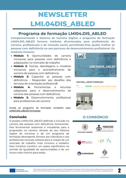 O projeto LMI.04.Dis_Abled visa dotar os profissionais de formação, inclusão social e laboral com competências e ferramentas adequadas para fornecer serviços de qualidade no que concerne à orientação profissional de pessoas com deficiência, de forma a facilitar a sua inclusão no mercado de trabalho